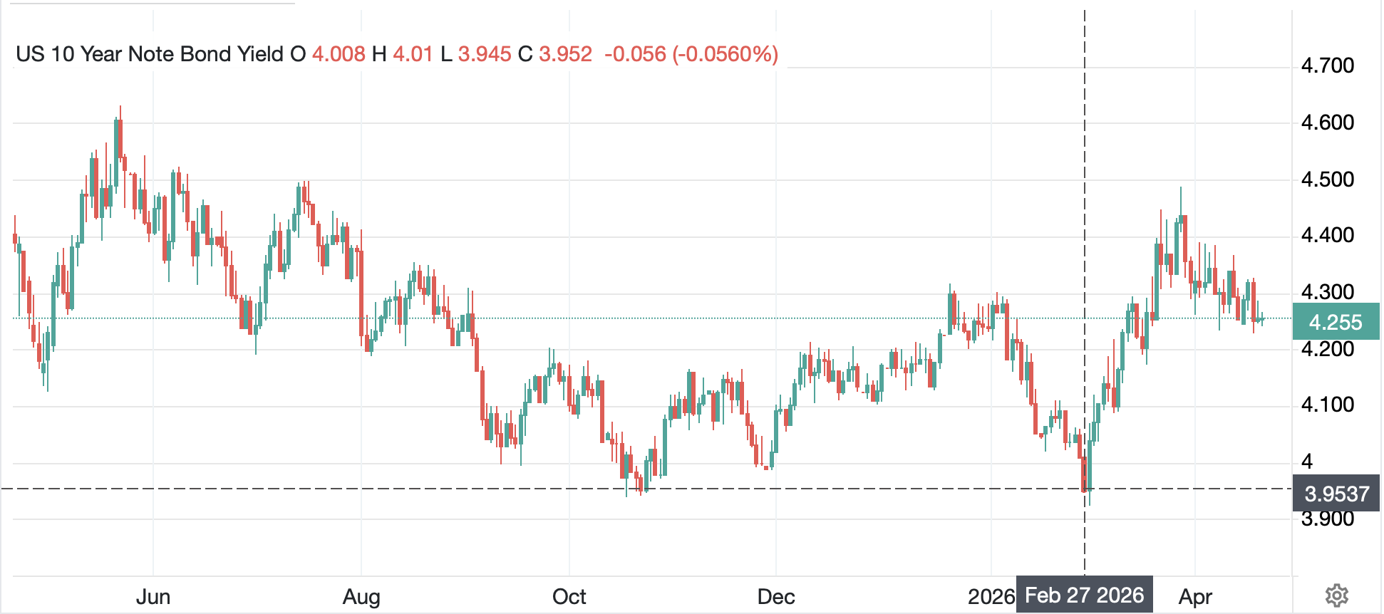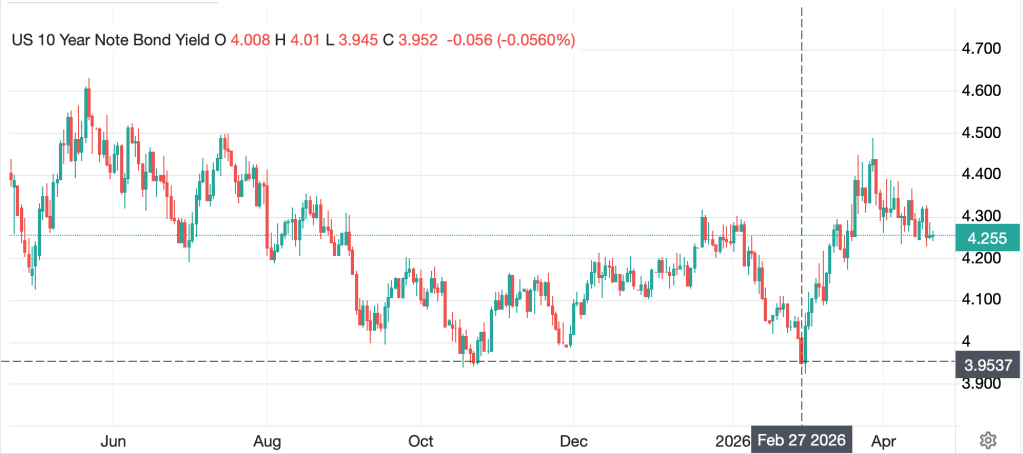 Thus, my fear is that fairly soon, the second stage of this conflict is going to ignite.  If this is the case, the recent market insouciance over the situation seems likely to change dramatically, at least for a little while.  This implies that oil prices will spike higher again along with the dollar, while equities and gold will slump.  I assume bond yields, too, will rise somewhat.  Looking at a chart of yields, though, the current level is right in line with where they were for much of 2025 and at the beginning of 2026, and I am left to wonder if the move lower in yields in January and February, was the anomaly, not the return to current levels.