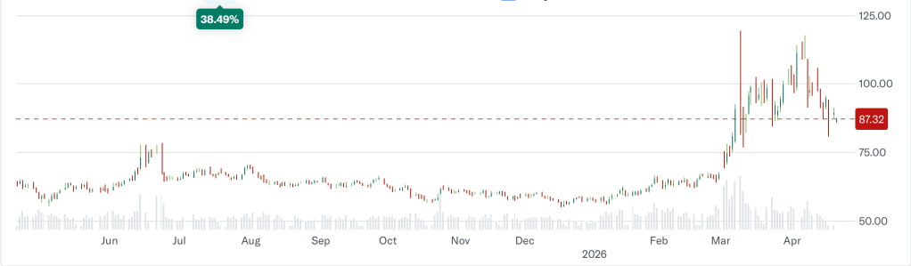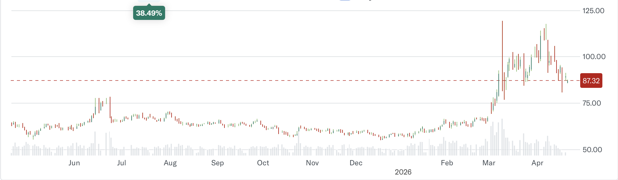 Oil (-0.2%) is hanging around awaiting the next story from the Persian Gulf and Strait of Hormuz, sitting between the level seen when it was declared the Strait was reopened and the level it touched when that was denied.  As you can see from the chart below, not only has oil been hanging around, but trading volumes (the light grey bars below the price chart) also appear to be sinking.  Everybody is holding their breath for the next thing here.