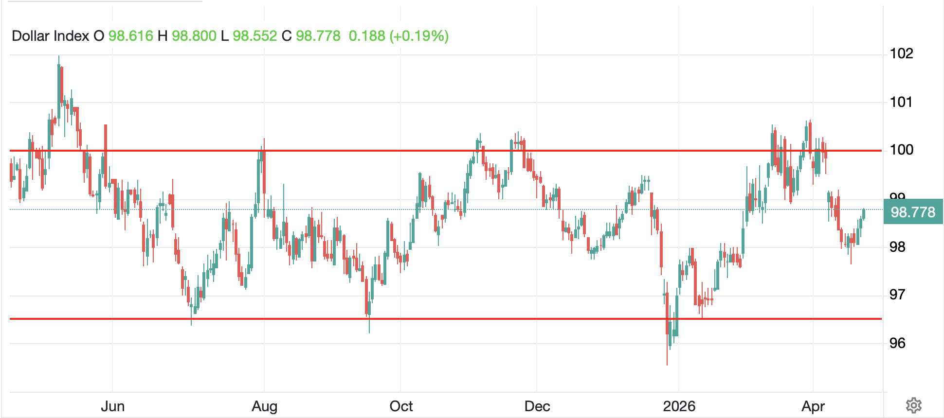 Finally, the dollar is rebounding a bit this morning, with the DXY (+0.2%) continuing to trade in its broad range from the past year as per the below chart.
