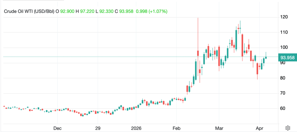 Oil (+1.2%) is beginning to get concerned again about the Iran situation as we are currently in the midst of a 3-day rally. While the WTI price, at around $94/bbl, is sitting in the middle of its range since the inception of the war, clearly there is some concern.