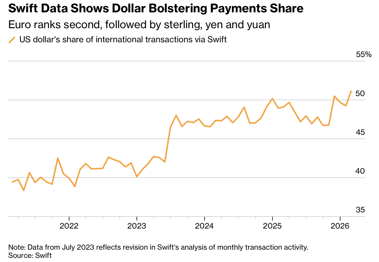 While the death of the dollar and de-dollarization narratives remain popular amongst a broad set of analysts, data outovernight from SWIFT shows that the dollar’s portion of international transactions rose to a record 51.1% in March, its highest level since SWIFT revised its procedures.