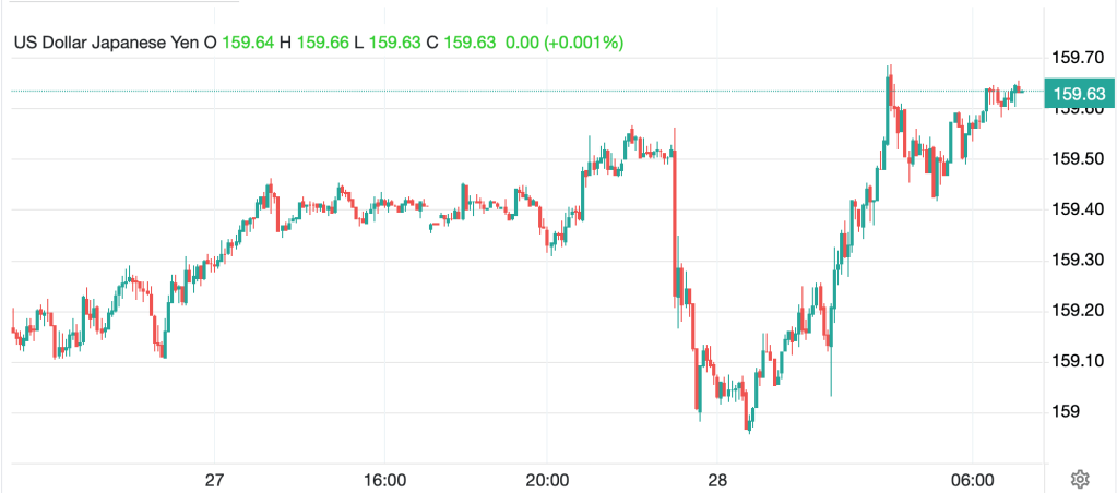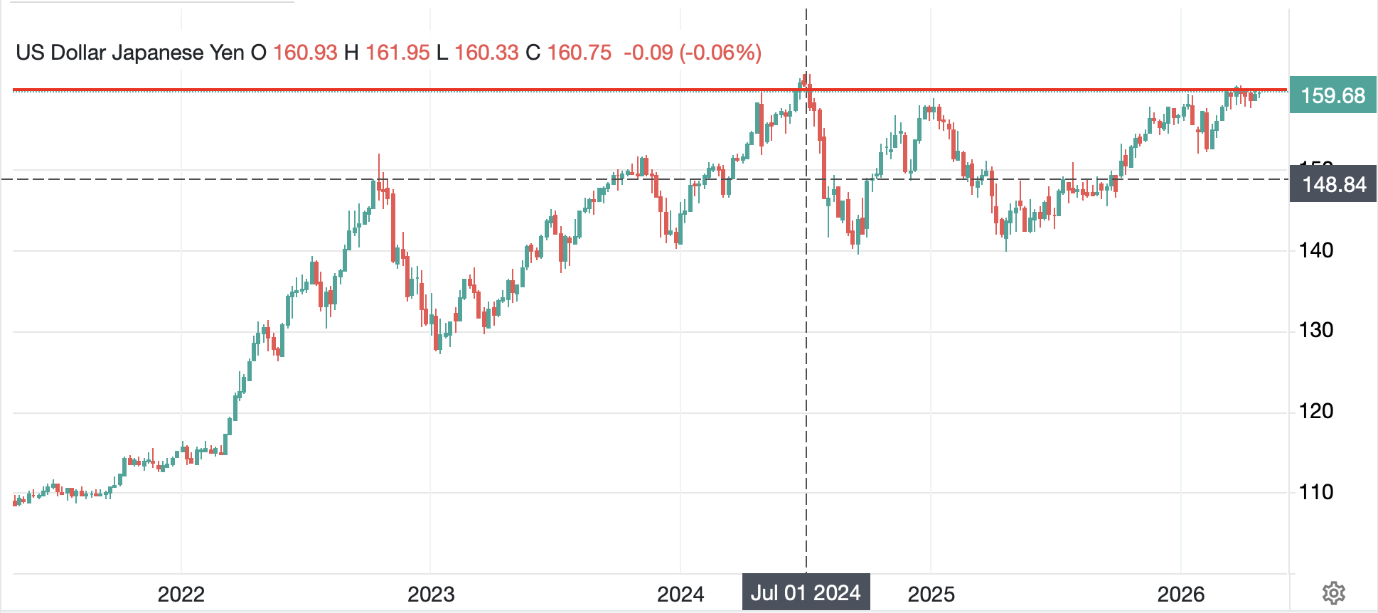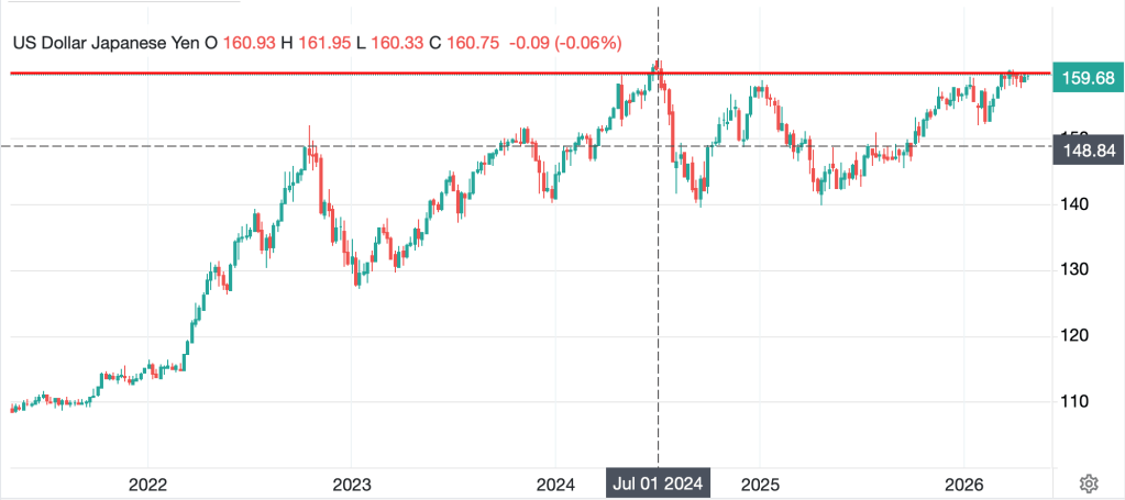 The overriding concern in the yen is whether it will weaken through (dollar above) the 160 level, which it briefly touched back in late March, but has since been trading just below. That is perceived by many as the ‘line in the sand’ regarding intervention. However, if we go back to the summer of 2024, when the BOJ last intervened, USDJPY was pushing 162 before they pulled the trigger as you can see below. It certainly suits them that the market is afraid of pushing this envelope, but my take is it will happen before too long.