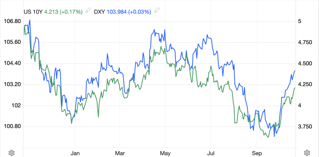 And you know what else continues to benefit as those interest rates refuse to decline? That’s right, the dollar continues to rally steadily against all comers. Using the DXY as a proxy, the greenback has rebounded 3% from its levels around the time of the last Fed meeting as per the below chart. I assure you, if I am correct that the Fed cuts 25bps in November and then doesn’t cut in December, the dollar will be much higher still. Something to watch for!