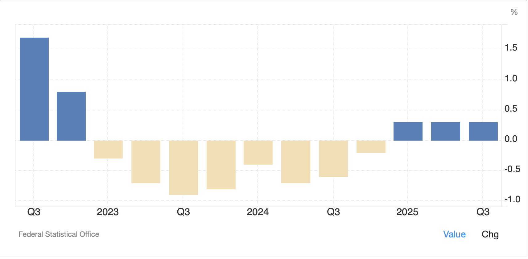 Ok, let’s turn to market performance overnight.  Japan (+0.1%) didn’t love the US tech story, which is somewhat surprising, although that may be because there continues to be growing concern regarding the JGB market and the spat with China.  China (+1.0%) and HK (+0.7%) however, both rallied on the US rate cut plus tech rally story.  Taiwan (+1.5%) and Thailand (+1.3%) also liked that story, but the rest of Asia was nonplussed, and more exchanges saw weakness than strength.  As to Europe, nobody there has a strong view this morning with every major bourse +/- 0.15% or less.  The only data was German GDP, which rose to…0.0% for Q3 and clocked in at +0.3% Y/Y! Look at the history of German economic activity over the past 3 years below and ask yourself if this is the powerhouse of Europe, why would anyone want to own any European assets?