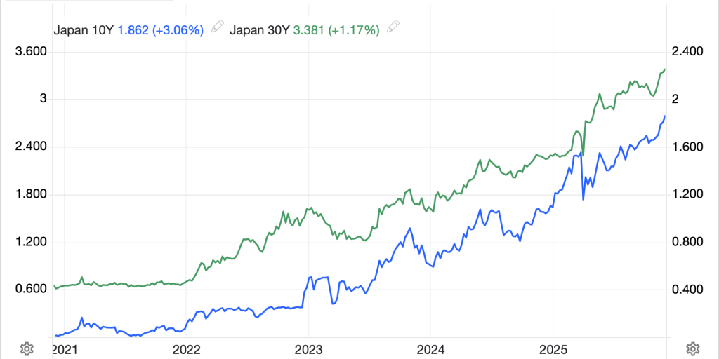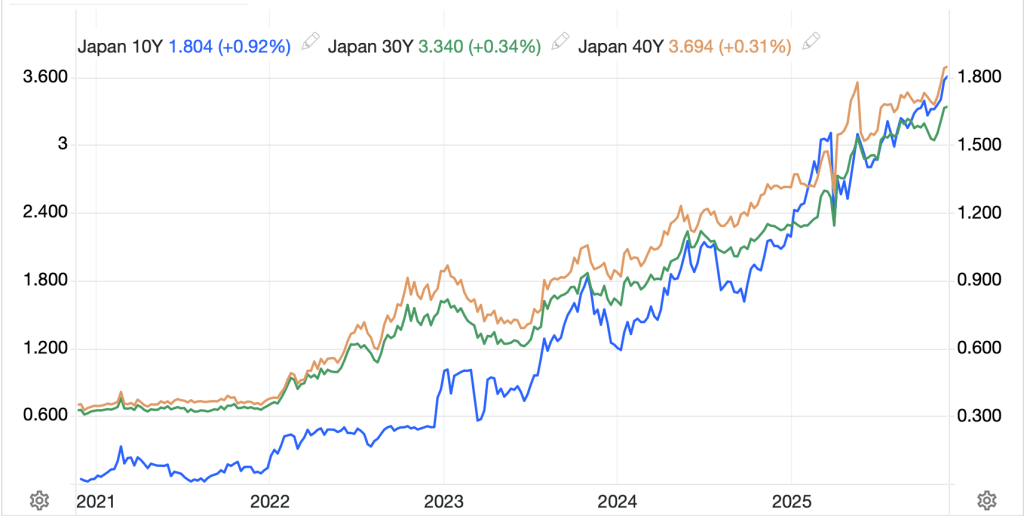 While you may think the US has a fiscal problem, and it does, at least it has the global reserve currency and with it, the ability to live beyond its means for a long time.  The UK, however, simply has the first part, a fiscal problem, which they have exacerbated by adopting the most idiotic energy policies in the world (who would ever have thought that solar power made sense in the UK given the fact it rains, on average, 50% of the days in the year.)  It is unclear to me what the UK can do to right the ship with the current government and its stated priorities.  I suppose that we will see new regulations requiring UK financial institutions to hold more Gilts as otherwise nobody will buy them.  Before I leave this asset class, I cannot ignore the JGB market where back-end yields continue to climb.  As you can see from the below chart, the 10-, 30-, and 40-year yields are all at record highs and show no signs of stopping their multi-year rise.