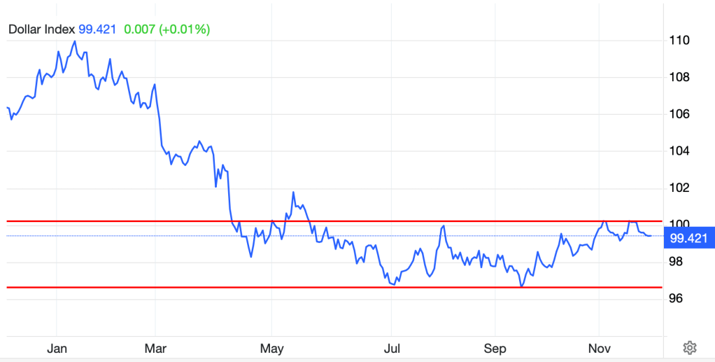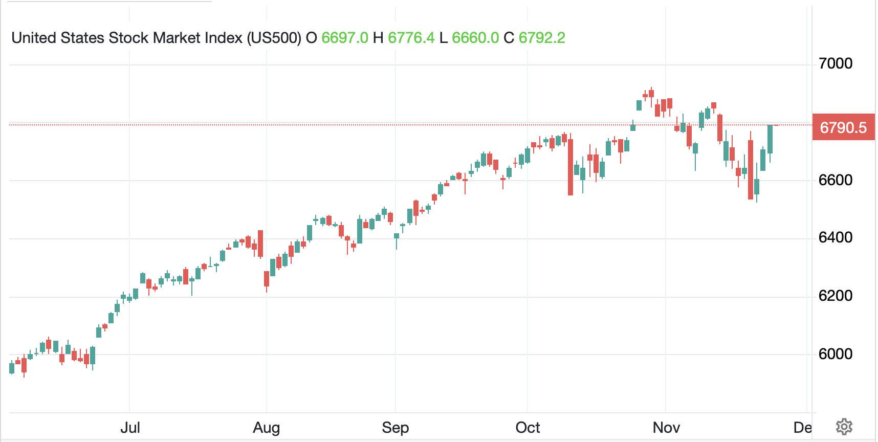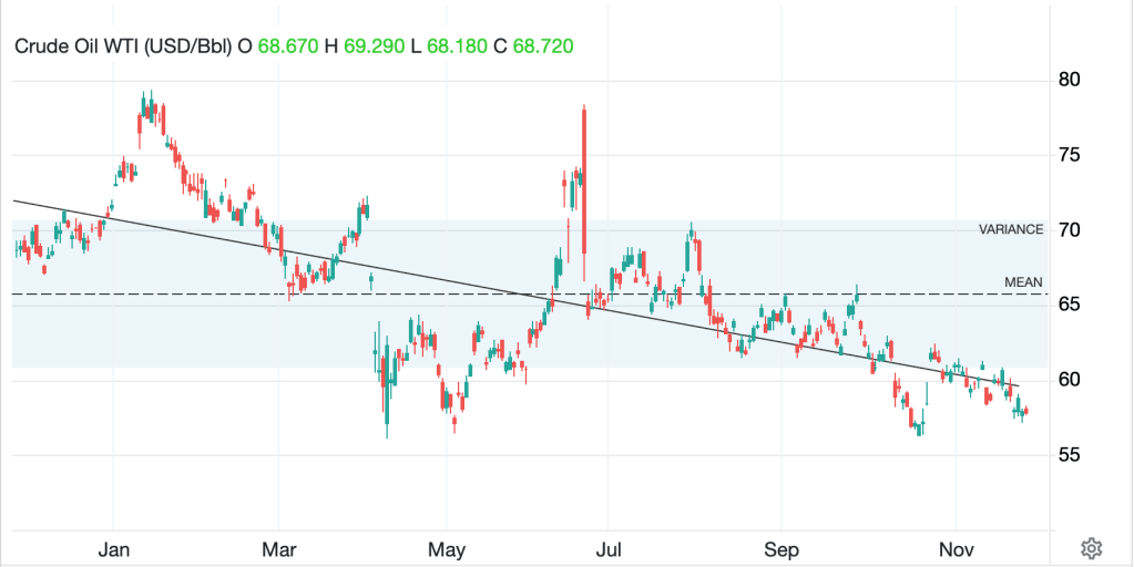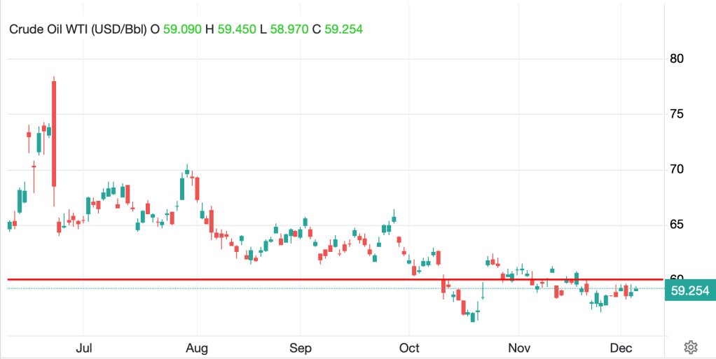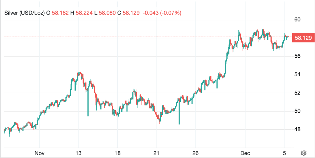 In the commodity space, oil (+1.3%) is bouncing back to its trend line after OPEC confirmed it will not be increasing production in Q1 next year at a meeting yesterday.  I would expect that a real peace deal would be negative for this market as some part of that would be the relaxation of sanctions, I would assume.  But maybe I’m wrong there.  However, I continue to believe the trend is modestly lower going forward as there is far more supply available.  As to the other metals, both copper (+0.6%) and platinum (+1.5%) are continuing their runs higher with no end currently in sight.