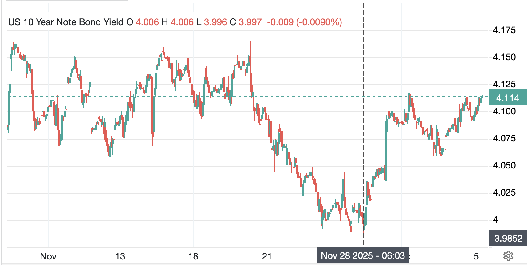 To conclude the equity portion of our discussion, yesterday saw the NASDAQ (-0.25%) decline in the face of a broad overall equity rally as there appears to be a rotation of investors from AI into other things like financials (as hopes of another Fed rate cut spring eternal) and power producers as the power needs of AI keep getting estimated ever higher.  This rally was followed pretty much everywhere around the world as regardless of one’s religion, it appears investors are all counting on Santa to deliver higher prices.  In Asia, Tokyo (+1.4%). HK (+1.75%), China (+0.6%), Australia (+1.2%), Korea (+1.4%) and virtually every other market rallied.  The only data of note here was Japanese IP which came in a tick higher than its preliminary forecast, but to counter that, Nikkei reported that the BOJ, when they meet next week, are definitely going to raise the base rate by 25bps to 0.75%, the highest level since 1994.  That doesn’t seem that bullish, but then, I’m not Japanese.