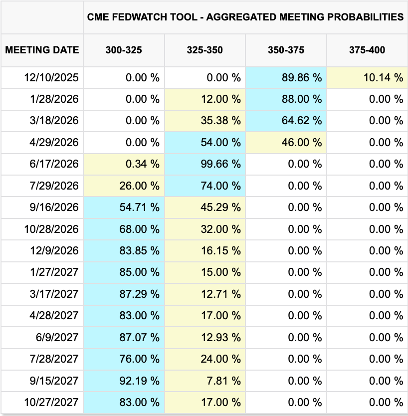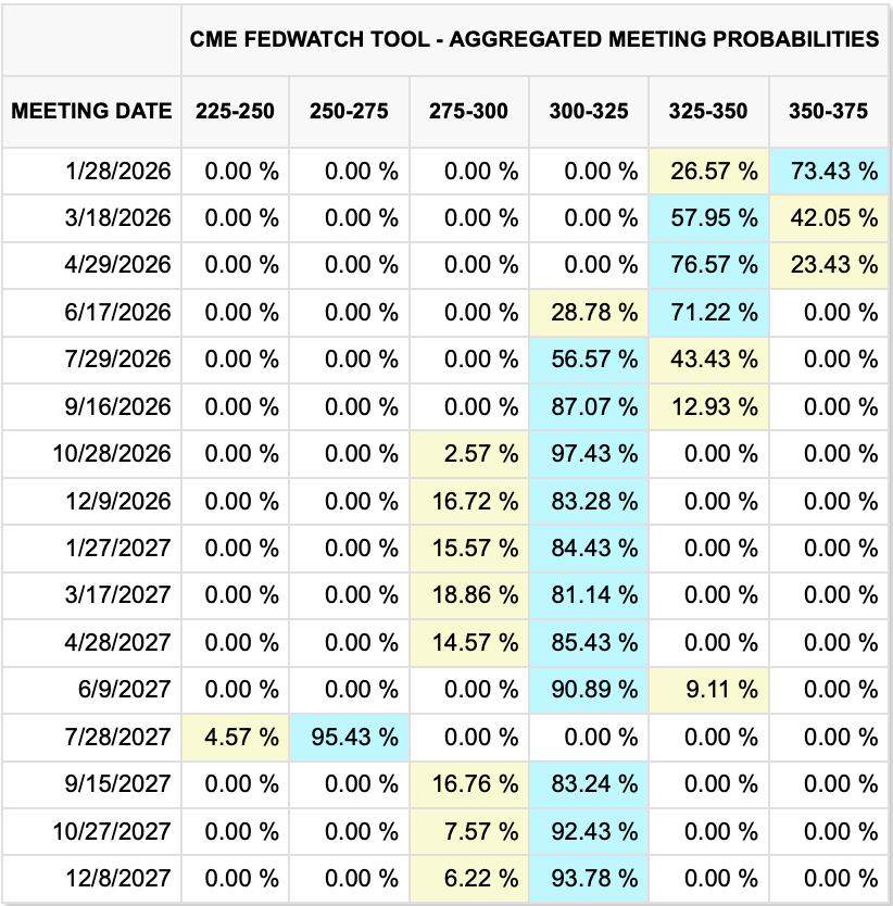 Keeping that in mind, there are two other stories of note this morning, only one of which is impacting markets.  The non-impactful one is that apparently President Trump has selected Kevin Hassett, currently the White House Economic Council Director, as the man to succeed Jay Powell in the chair.  He is a long-time political operative with deep ties in Washington and I presume will get through the vetting and be confirmed on a timely basis.  As I wrote above, it is not clear to me the Fed matters as much as other things in the current environment, although we will continue to hear about it.  In this light, the Fed funds futures market is currently pricing an 87.5% probability of a 25bp cut next week and is back to a 58% probability of a total of 100bps of cuts by the end of 2026 as per the below from the CME.
