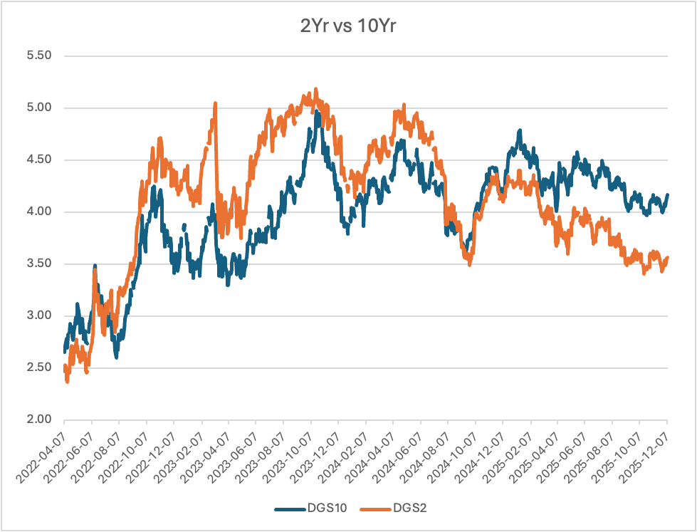 It wasn’t long ago when the market was pricing 100bps more of rate cuts by the end of 2026, meaning a Fed funds rate of 2.50% – 2.75%.  However, the narrative has shifted over the past several weeks after very mixed signals from FOMC speakers and data releases that have indicated the economy is not cratering (e.g. yesterday’s JOLTS data printing at 7.658M, >400K higher than expected).  You may recall that shortly after the last FOMC meeting at the end of October, the probability of today’s rate cut had fallen to just 30%.