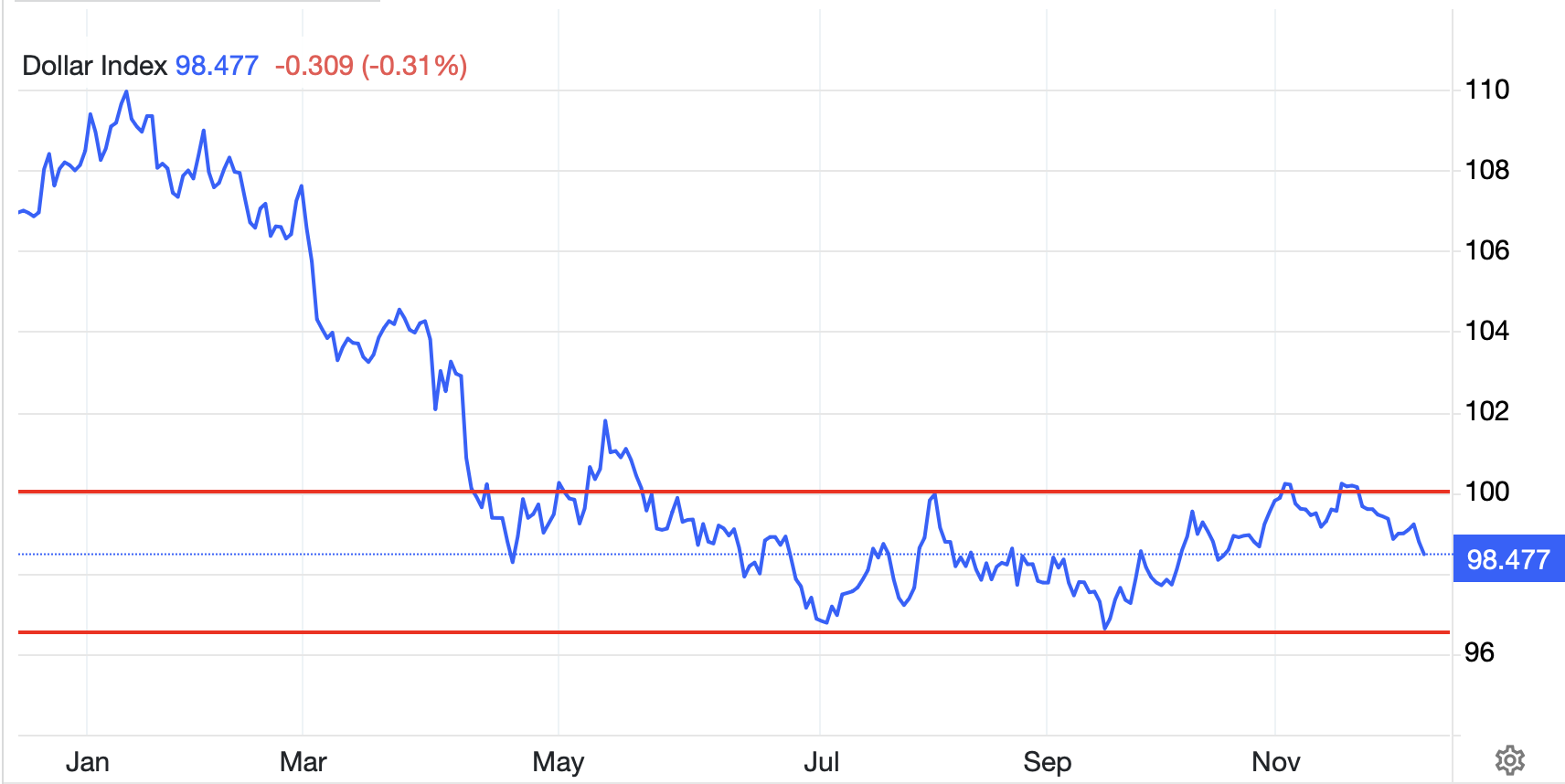 Meanwhile, in Europe, red is the color led by Germany’s DAX (-1.5%) although with weakness across the board (CAC -0.8%, IBEX -0.6%, FTSE MIB -0.9%).  Apparently, the story that progress has been made regarding peace talks in Ukraine is not seen as a positive there.  After all, if there is peace, will European governments still be so keen to build out their military, spending billions of euros at local defense and manufacturing firms?  It seems after a very strong close to the month in November, there is a bit of profit taking underway this morning.