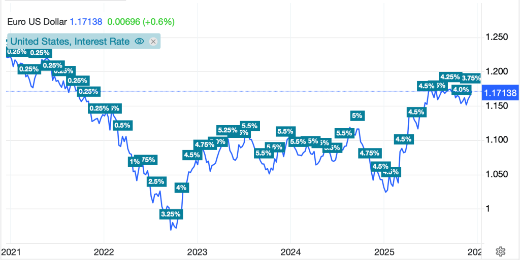 One of the key talking points this morning revolves around the dollar in the FX markets and how now that the Fed has cut rates again, while the ECB is set to leave them on hold, and the BOJ looks likely to raise them next week, that the greenback will fall further.  Much continues to be made of the fact that the dollar fell about 12% during the first 6 months of 2025, although a decline of that magnitude during a 6-month time span is hardly unique, it was the first such decline that happened during the first 6 months of the year, in 50 years or so.  In other words, much ado about nothing.