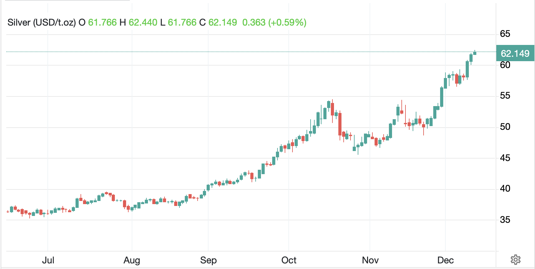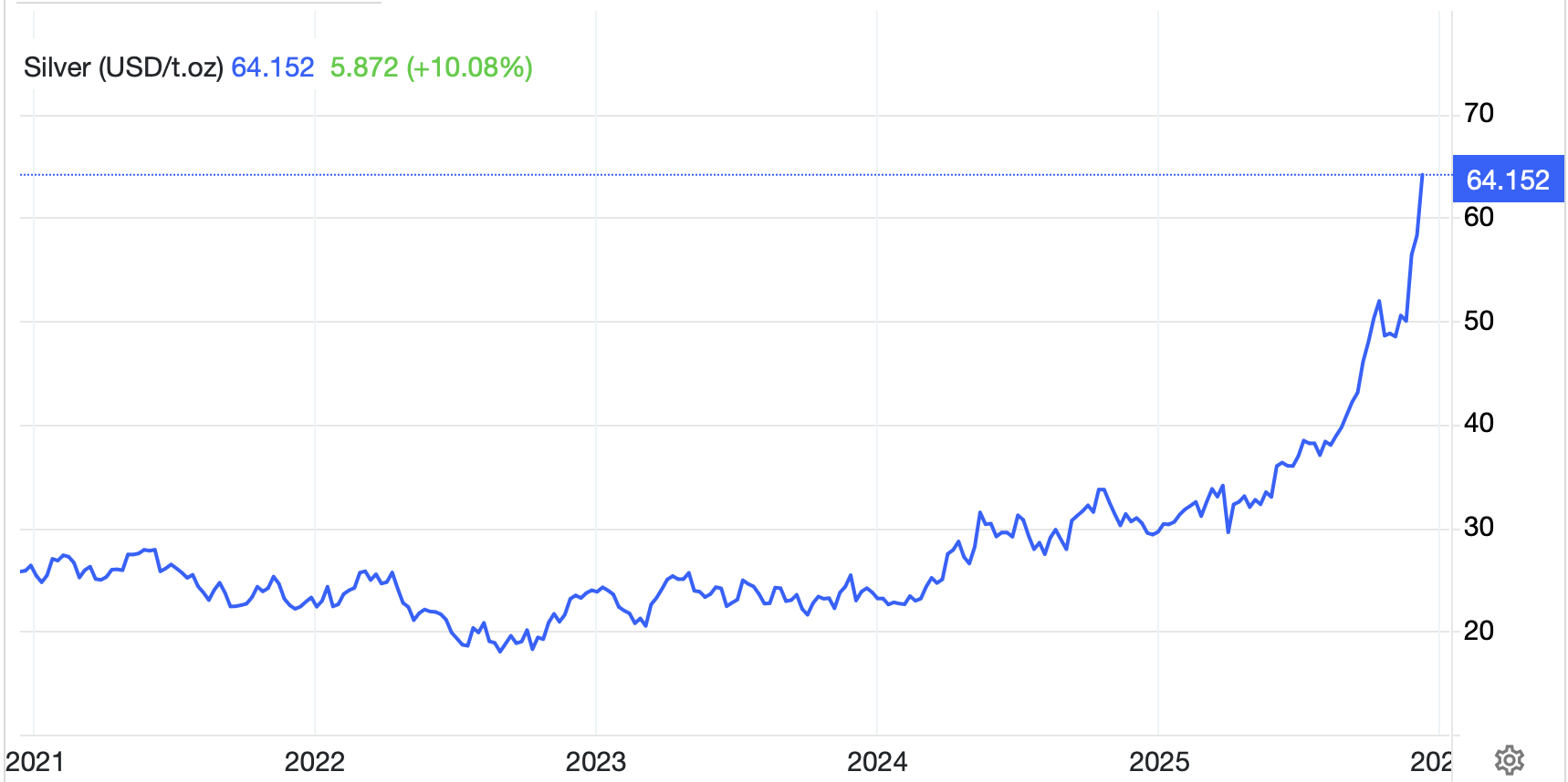 But the other story that is getting press, and arguably more press, is precious metals.  Silver (+0.9% today, +10% this week, +122% this year) is the leader and is now trading above $64/oz.  This is the very definition of a parabolic move, which is obvious when you look at the silver chart for the past 5 years.