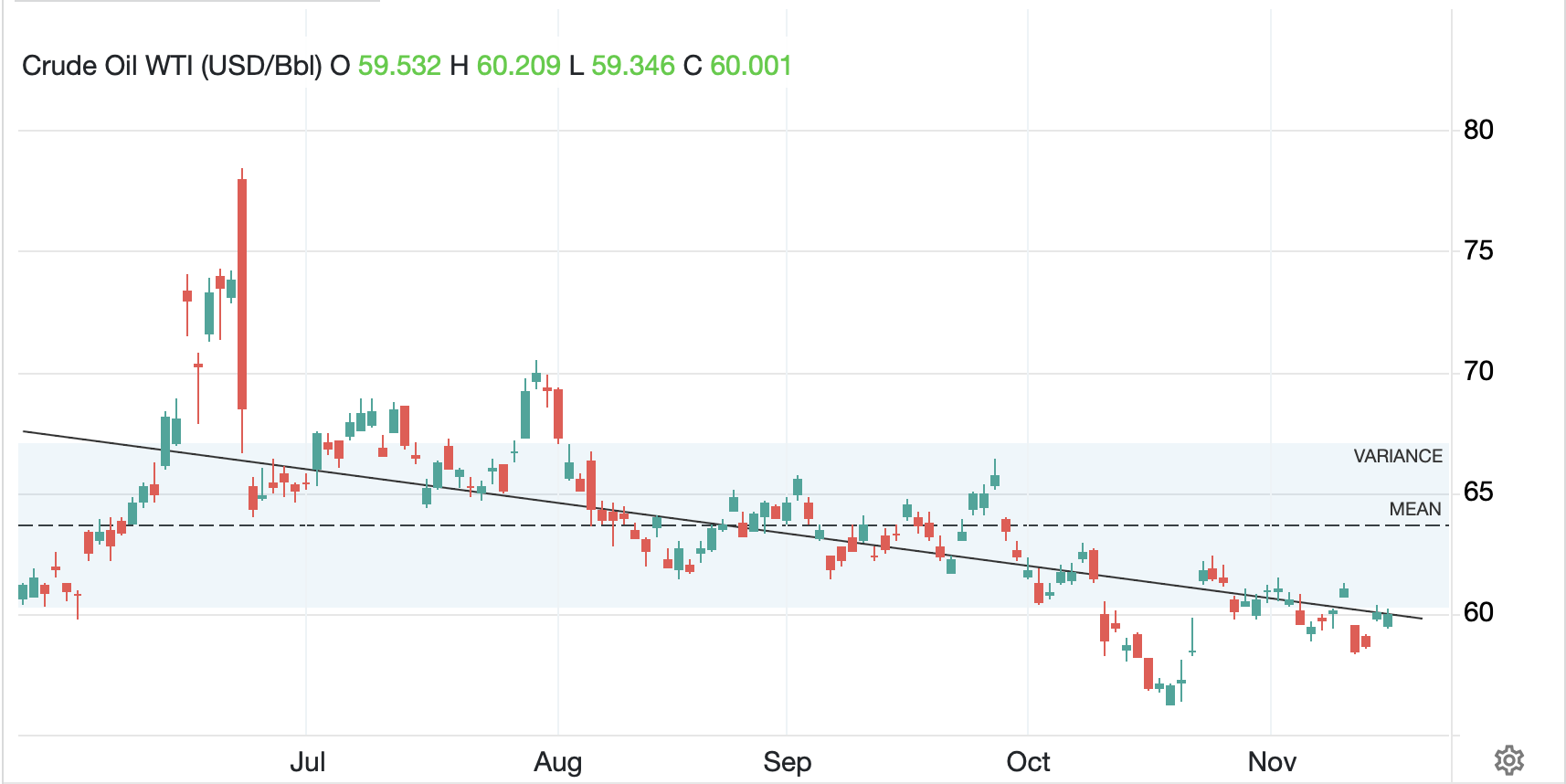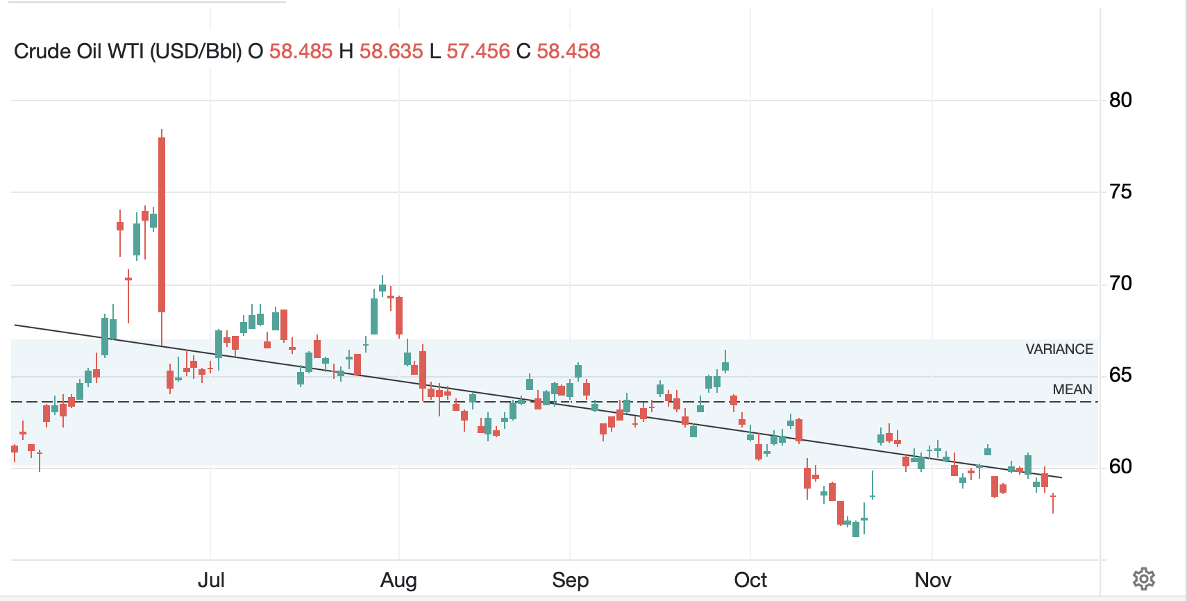 In the commodity space, oil (-0.25%) continues to drift lower and the trend remains very much in that direction as can be seen in the chart below. There was a very interesting article by Doomberg on Substack this week, reviewing their call that the idea of peak cheap oil is a myth, and there is a virtually unlimited supply of hydrocarbons available with only the politics preventing more production. (For instance, consider the UK essentially shutting down their North Sea oil production despite being in the midst of a self-inflicted energy crisis with the highest electricity prices in the world. That’s not geology, that’s politics.) But geology shows there is plenty to go around and growing supply will continue to pressure prices lower.