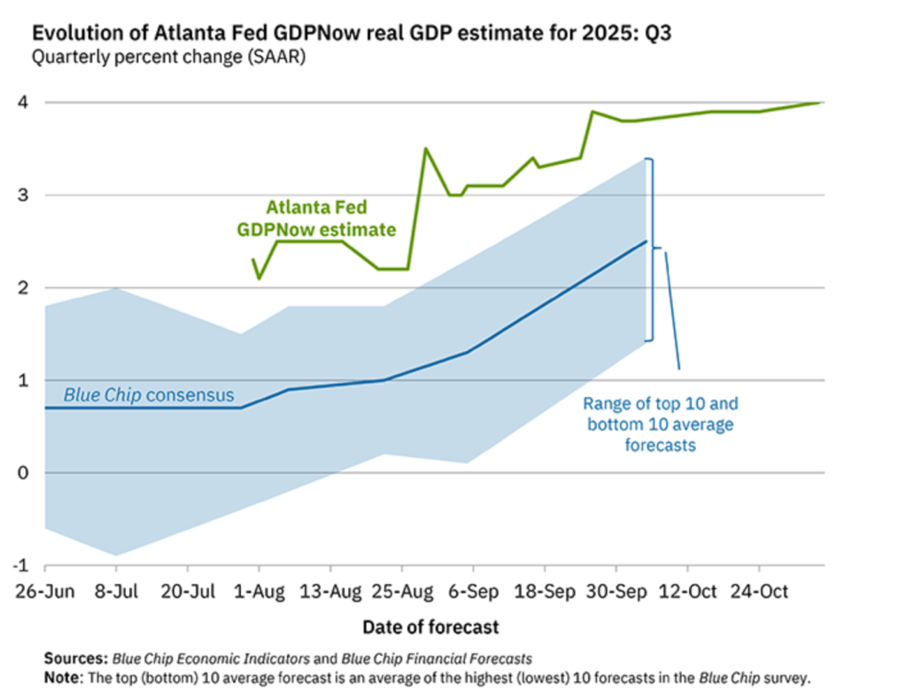 Arguably, the reason we have seen such a large dichotomy between analyst views is that some are focused on data that represents the bottom leg of the ‘K’ and see a recession around the corner, if not already upon us. Meanwhile, others see the arm of the ‘K’ and see good times ahead. Certainly, if we look at the broad-based GDP readings, at least based on the Atlanta Fed’s GDPNow forecast, Q3 was remarkably strong at real GDP growth of 4.0% annualized (see below chart). Calling for a recession with that as backdrop is a very difficult case to make, in my view, but that won’t stop some analysts from trying.