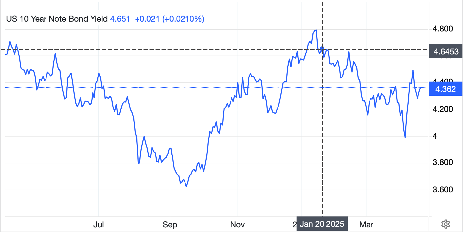 Ok, I’ll step down off my high horse and let’s look at how markets behaved overnight. After yesterday’s second consecutive rally in the US, the picture elsewhere in the world is more mixed. In Asia, the Nikkei (+0.5%) continued its rebound but the Hang Seng (-0.75%) and CSI 300 (-0.1%) saw no benefit overnight. Elsewhere in the region winners and losers were pretty evenly split and nobody saw a movement of more than 0.8% in either direction. In Europe, red is today’s color, but it’s a pale red with losses across the board of the 0.1% to 0.25% variety. The only news overnight was German Ifo data, which showed a bit of a surprising uptick in the current business climate as well as expectations. Perhaps the promise of more German fiscal largesse is outweighing concerns over tariffs. As to US futures, they, too, are lower by about -0.15% at this hour (7:20).