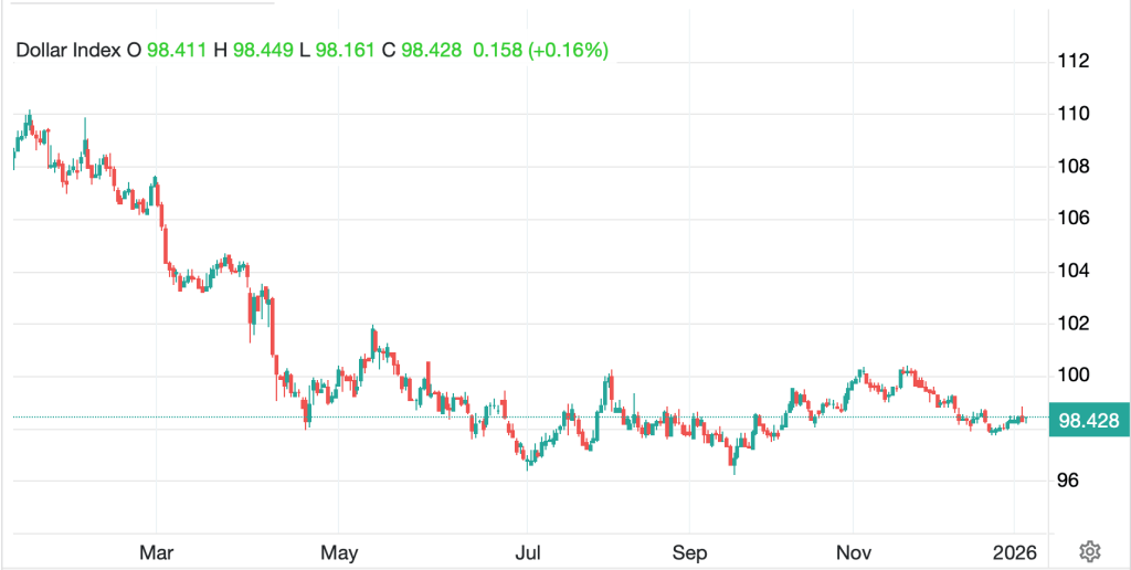 Lastly, the dollar…is still there. Using the DXY as my proxy this morning, you can look at the chart below for the past year and see, it has basically not moved since it stopped declining in late April 2025. It is hard to get excited about things right now. However, I maintain that the US will remain the cleanest dirty shirt and benefit accordingly over time.