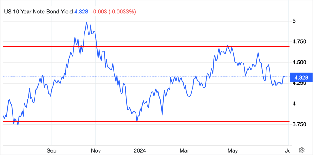 Treasury yields have also been largely range bound, and if anything, look like they are heading lower despite fears being flamed regarding massive amounts of issuance having trouble finding buyers as foreigners pull out of the market.  Maybe not.