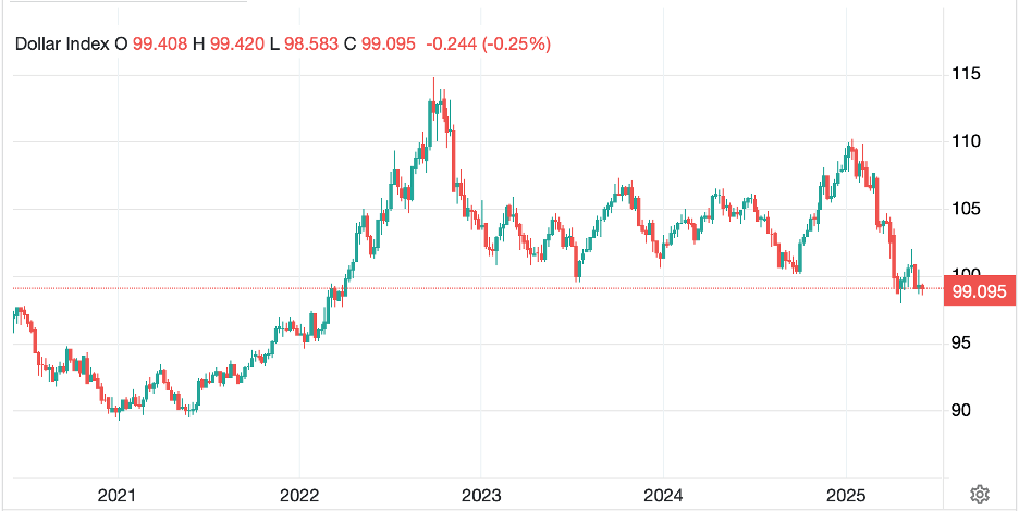 But if we look at how the dollar has performed over the past several sessions, using the DXY as our proxy, we can see that despite a very modest -0.1% decline overnight, it appears that the dollar may be breaking its medium-term trend line lower as per the chart below from tradingeconomics.com