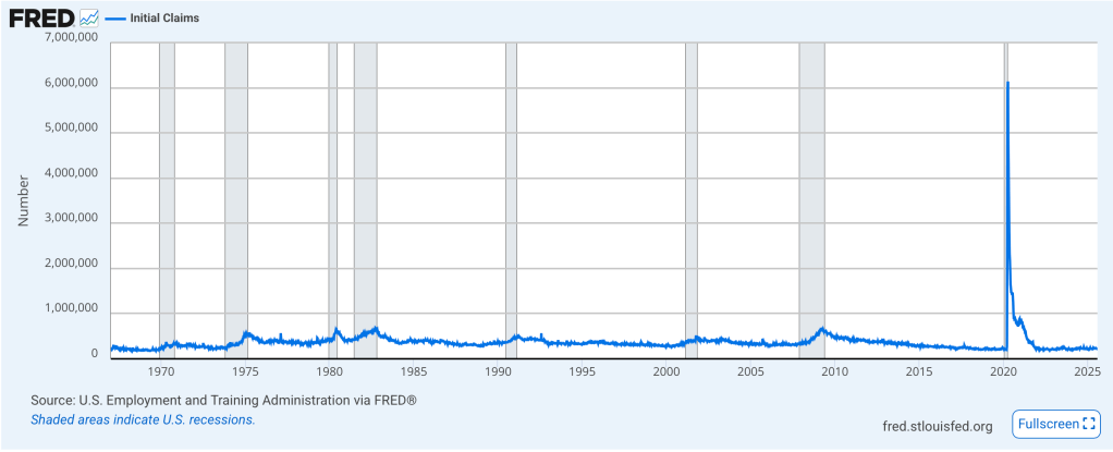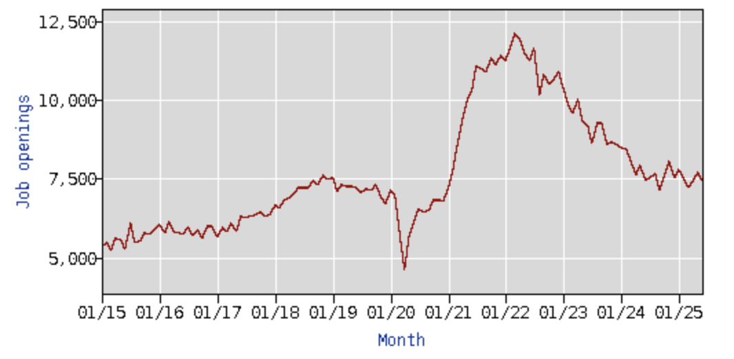 Challenger job cuts are rising again, with much of the blame put on AI.  JOLTS Job Openings have been trending lower since Covid, but it is difficult to really tell there, as the levels are far above pre-Covid data as per the below BLS chart.