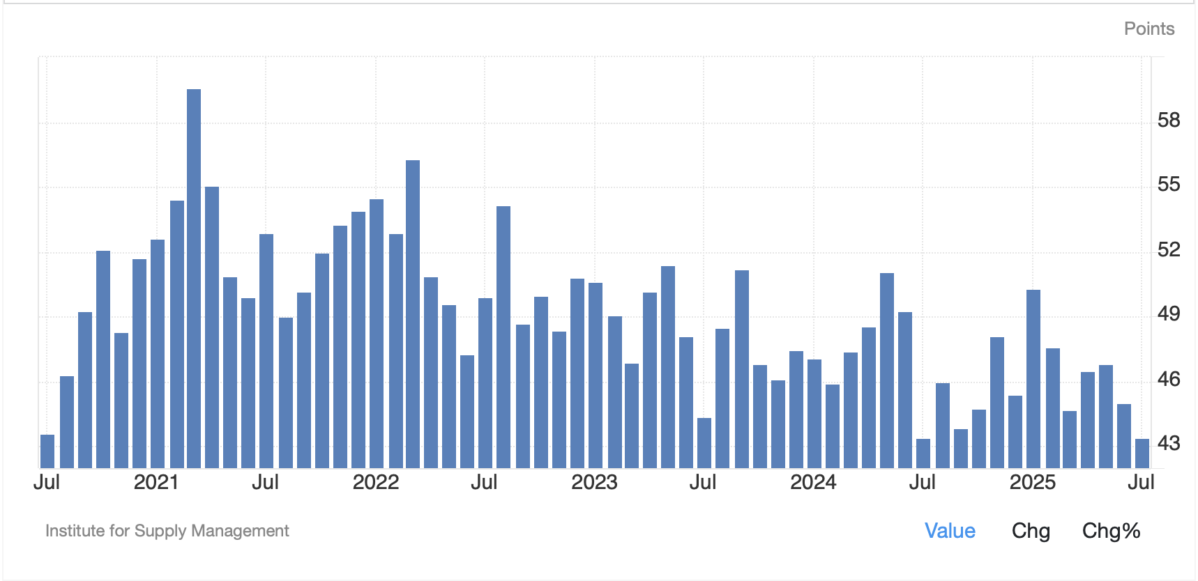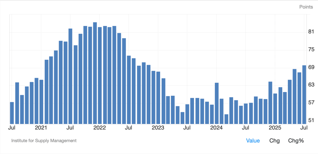 As to inflation, there continues to be a strong set of beliefs that tariffs are going to create a significant uptick, although it has yet to appear.  ISM Prices paid did rise in Services, to 69.9, their highest level since the retreat from the 2022 “transitory inflation”.