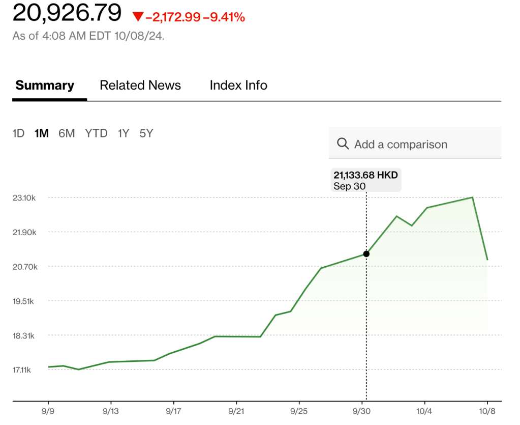 Talk about buzzkill. The Chinese Golden Week holiday is over and all the hopes that the National Development and Reform Commission Briefing would highlight new stimulus as well as further details of the programs announced prior to the holiday week were dashed. Instead, this group simply confirmed that they were going to implement the previously announced plans and insisted that it would be enough to get the economy back to its target growth rate of 5.0%. You may recall that the government had promised funds to support the stock market and some efforts to support the housing market, but there was little in the way of direct support for consumers. While the initial market response to the stimulus measures was quite positive, there is a rapidly growing concern that those measures will now fall short. In the end, much of the joy attached to the stimulus story has evaporated.