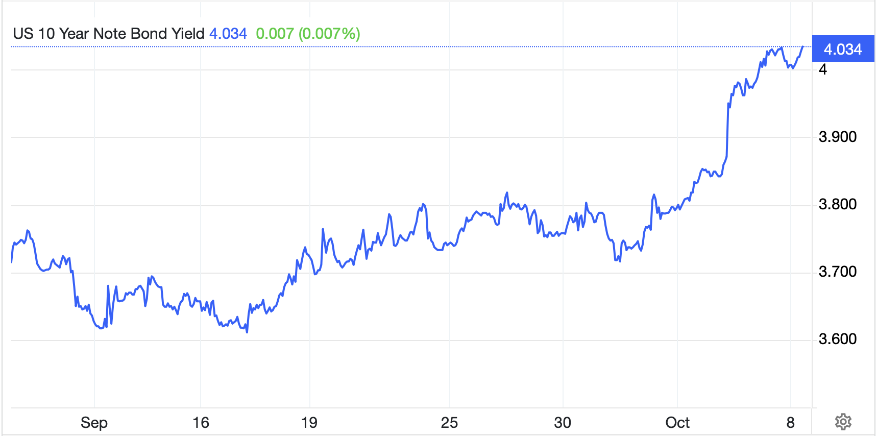 So, what’s driving things? Arguably, interest rate policies and bond markets are having the biggest impact on financial markets right now. With that in mind, the fact that 10-year Treasury yields are now back above 4.0% for the first time since August seems to be the main event. Why, you may ask, would bond yields have backed up so far so fast? Ultimately, it appears that bond investors are losing confidence in the central bank inflation story, the idea that they have it under control. First off, oil prices, though lower today by -1.9%, have still gained more than 8.3% in the past week with gasoline prices higher by nearly 7% in the same period. This does not bode well for lower inflation prints going forward. Second, the combination of the much stronger than expected NFP report and the Fed’s willful ignorance of the implications is also tipping the marginal investor toward seeing more inflation going forward.
