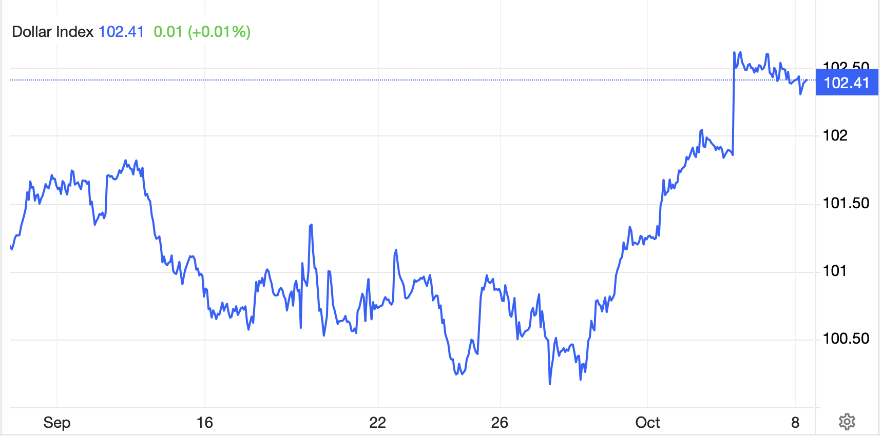 Finally, the dollar is backing off a bit this morning, although as evidenced by the chart below of the DXY, it has been on a bit of a tear for the past week, so consolidation should not be a surprise.