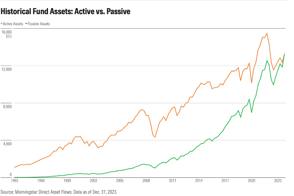 The essence of his work is that the rise in passive investing has had major consequences for equity markets, and by extension other financial markets. When John Bogle founded Vanguard with the goal of popularizing passive index investing, it represented a tiny fraction of the market and so, its low fees made it an excellent source of capturing market beta unobtrusively. However, in the ensuing 50 years, and especially in the last 20 when 401K plans were flipped from opt-in to opt-out by government regulation, things have changed dramatically.
