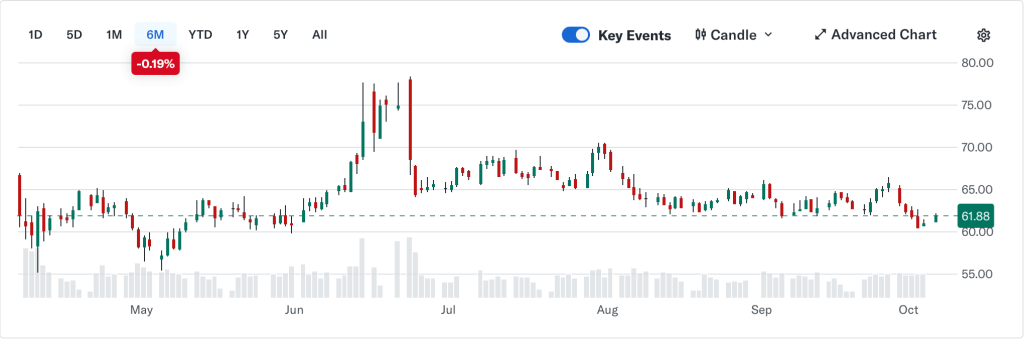 I’ve already highlighted precious metals, although copper (-0.7%) is bucking the trend, albeit after having risen more than 10% in the past month. Oil (+1.4%) is also continuing to bounce off the bottom of the range trade and remains firmly ensconced in the $61.50 to $65.50 range as it has been for the past six months. In fact, looking at the chart below from Yahoo finance, you can see that except for the twelve-day war between Israel and Iran, nothing has gone on here. The net price change in the past six months has been just -0.19% as you can see in the upper left corner. While this will not go on forever, I have no idea what will break this range trade.