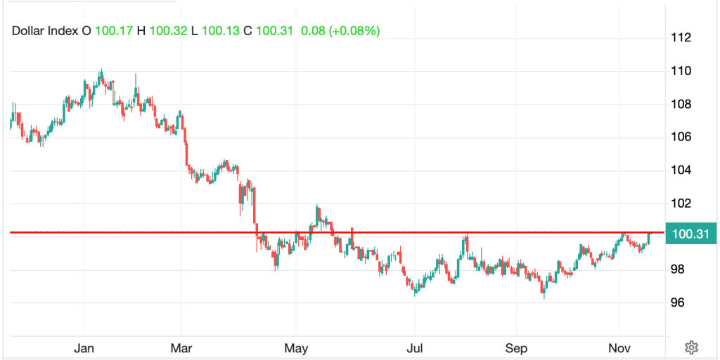Finally, other currency movements beyond the yen (-0.3% today) are of a similar size across both the G10 and EMG blocs. Using the DXY as proxy, this is the third test above 100 since August 1st with many analysts are calling for a breakout at last.