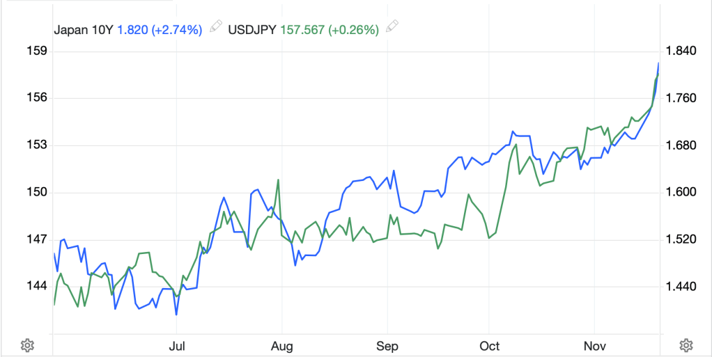 In the past six months, the yen has fallen >10% vs. the dollar and is lower by nearly 4% in the past month. At the same time, JGB yields are starting to accelerate higher, trading to yet another 20-year high at 1.82% and the price action there is remarkably similar to that of USDJPY as per the below chart. The problem for the JGB market is the BOJ already owns more than 50% of the outstanding debt, so buying more doesn’t seem to be a solution, whereas buying JPY in the FX market will have an impact, albeit short-term if they don’t change policies.