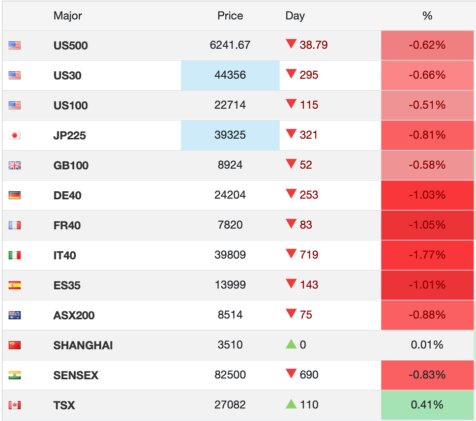 But for our purposes, the market response is the place we need to look. First, it can be no surprise that the Canadian dollar quickly declined -0.5% on the announcement as that is the textbook response to tariffs, the country affected sees their currency weaken. As to equity markets, as there are no TSX futures, we cannot tell exactly how stocks in Canada will be impacted but based on the fact that virtually every market is lower this morning, I expect to see weakness there as well. in fact, a look at this listing of equity futures markets from 6:30 this morning shows exactly what is happening. You will note that the Toronto market still reflects yesterday, but pretty much every other nation is feeling the heat of a new potential wave of tariffs from the US.