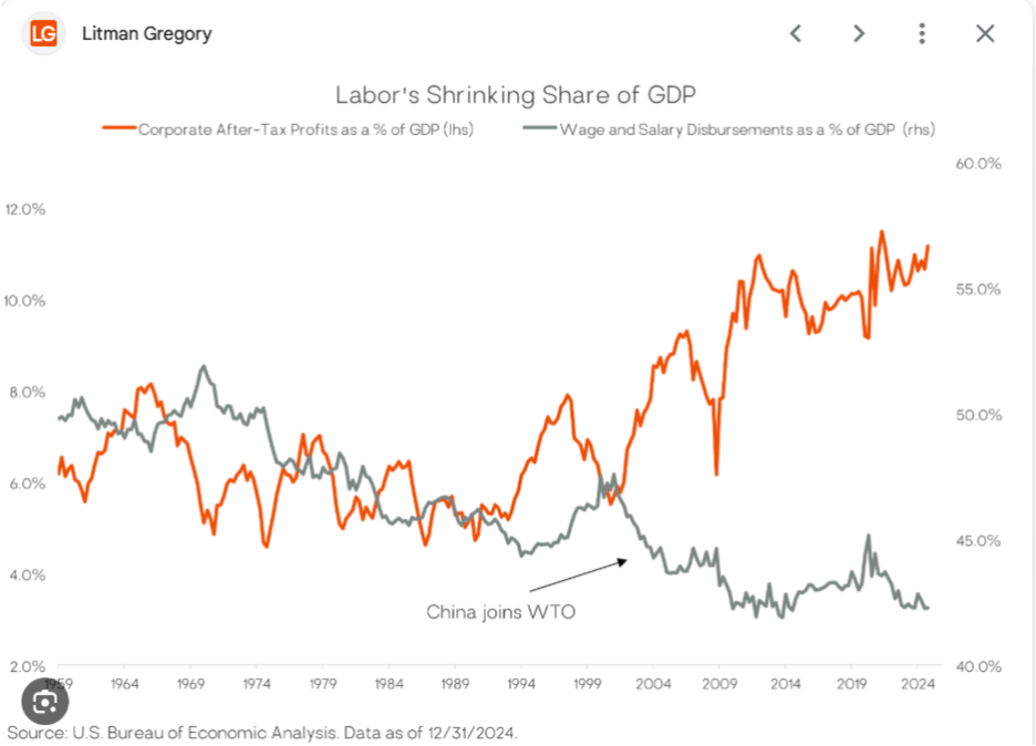 Rather, I believe any correction will now come from a broader economic result, arguably the long forecast recession when it finally arrives. If you recall, on Sunday I wrote about how the relative gain in corporate profits vs. labor has been a key driver in the bifurcation in the country. I also strongly believe that President Trump is very serious about changing that situation. The obvious solution is to reduce corporate profits. One way to do that is to impose tariffs where companies wind up reducing their margins to maintain sales volumes. If inflation does not rise (and it has not done so yet) that is a step in the President’s direction of choice. I have no idea whether this will work, and arguably neither does anybody else. Virtually, every economic model is no longer viable as Mr Trump has changed the rules so completely that the underlying assumptions are almost certainly incorrect. But remember this chart, if by the end of his term in 2028, the two lines have begun to converge more clearly, he will have changed a multi-decade trend and likely to the detriment of equity markets.