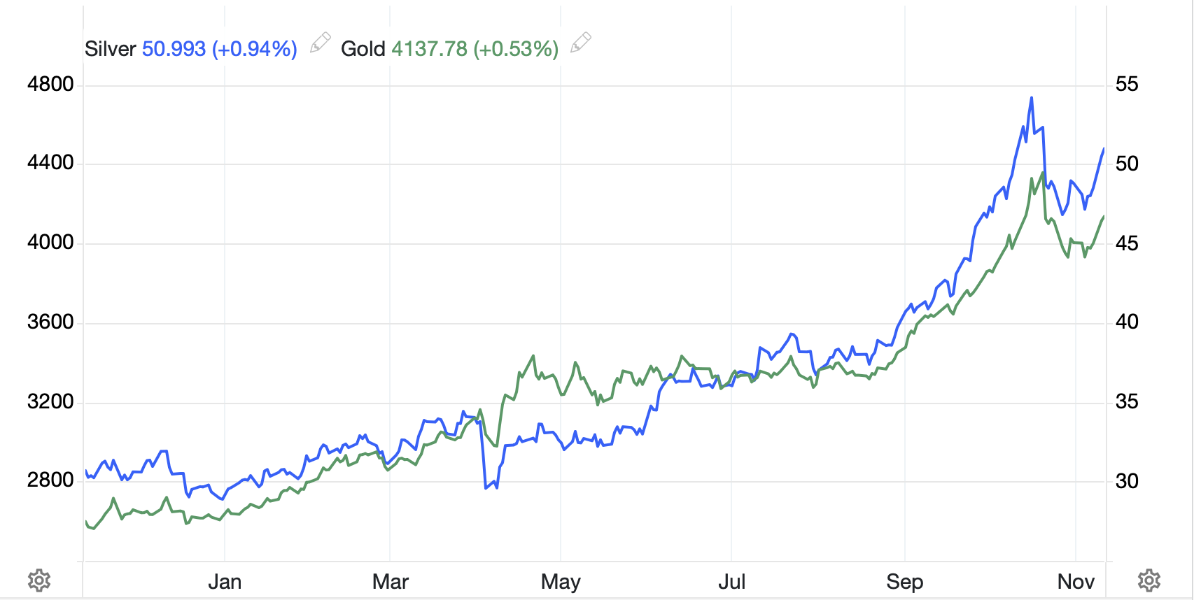 But the other story that is getting press, and arguably more press, is precious metals. Silver (+0.9% today, +10% this week, +122% this year) is the leader and is now trading above $64/oz. This is the very definition of a parabolic move, which is obvious when you look at the silver chart for the past 5 years.