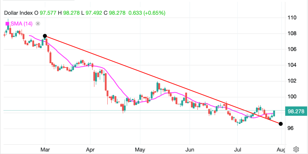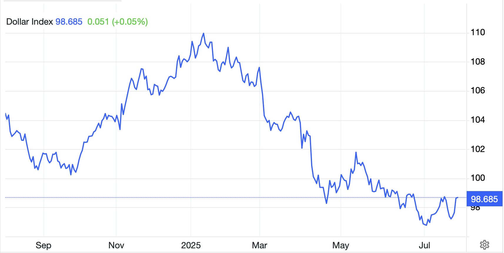 Yesterday’s market activity was benign with modest market movements in both equity and bond markets although the dollar did rally sharply, on the back of the EU trade deal. Of course, economic theory predicts just that, when tariffs on a nation (or bloc of nations) are raised, that currency will decline in value to offset the tariffs. Recall, this was the expectation in the beginning of 2025 when President Trump was just coming into office and calling himself ‘Tariff Man’ as he explained he would be imposing tariffs on virtually all US trading partners. However, back then, the theory didn’t work out very well and the dollar declined throughout the first six months of the year as can be seen below.