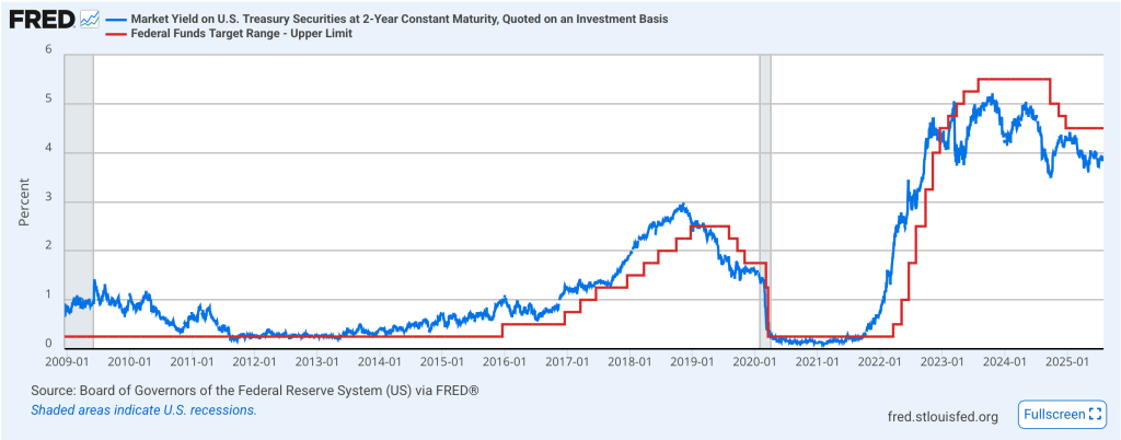 And yet the other side of that coin is a look at 2-year Treasury yields, which have a long history of accurately forecasting future Fed Funds levels. Right now, as you can see in the below chart, they are trading at a 50 basis point discount to Fed Funds, an indication that the market is quite convinced the Fed is going to cut rates. Ironically, I believe that Chairman Powell, a PE guy by background, is a strong believer in lower interest rates and I’m sure all his colleagues from his time at Carlyle Group are also pressing for lower interest rates, but he doesn’t want to seem cowed by Trump.
