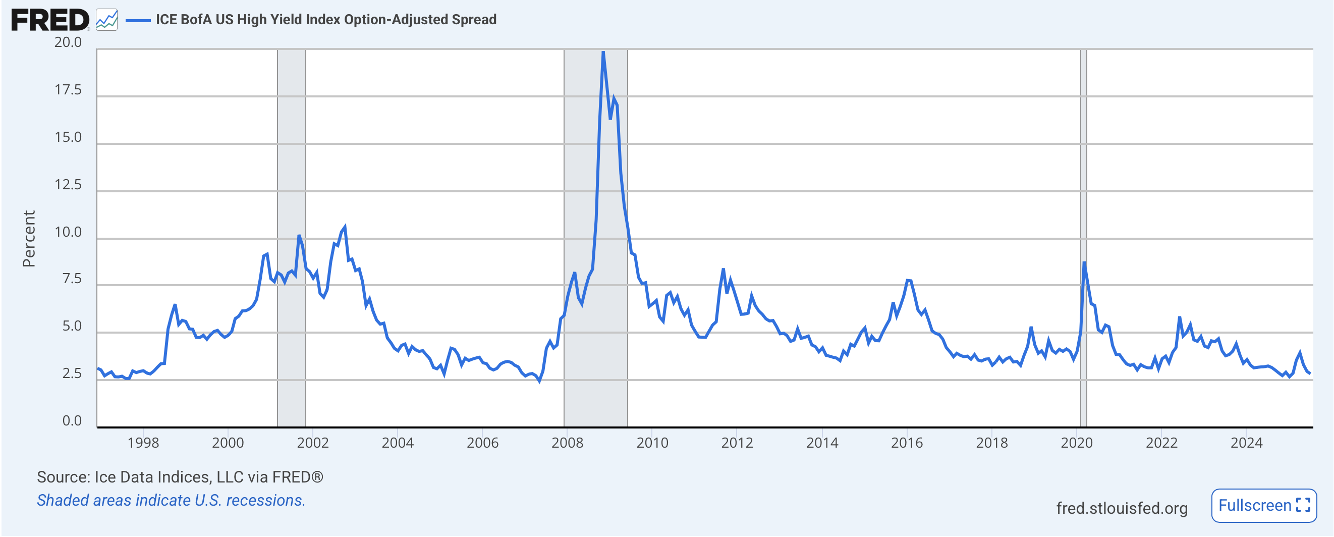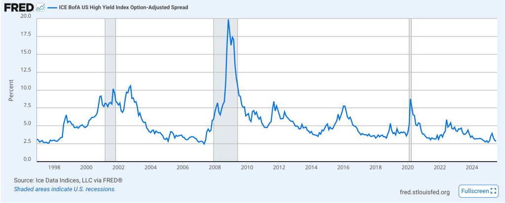 Remember, a key portion of the short dollar thesis is that the Fed is going to cut rates more than other central banks going forward. And now that the FOMC’s meeting is starting this morning, let’s discuss that idea. We all know that President Trump has been a vocal advocate for significant rate cuts immediately. However, let’s look at some evidence. On the one hand, equity markets are at historic highs in terms of prices as well as readings like the Buffett ratio (market cap/GDP) and P/E and P/S ratios as well. Crypto currencies, arguably the most speculative of assets, have been flying, especially things like meme coins, which are literally a play on the greater fool paying someone more than they paid for a token with no intrinsic value whatsoever. Credit spreads, especially for weak credits, are pushing historic lows as per the below chart. All these things point to not merely ample liquidity and policy being appropriate, but excess liquidity and policy being easy.