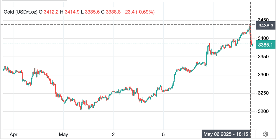 The world felt like it was ending on Friday as the early price action showed all the asset classes that have been rallying dramatically, notably gold and stocks, falling sharply. But a funny thing happened on the way to the close. While gold stopped declining, it had no rebound whatsoever, yet the equity market rallied sharply late in the session to close in positive territory. The below chart (taken Sunday evening) shows that the two assets tracked each other pretty closely right up until lunchtime Thursday and then diverged sharply.