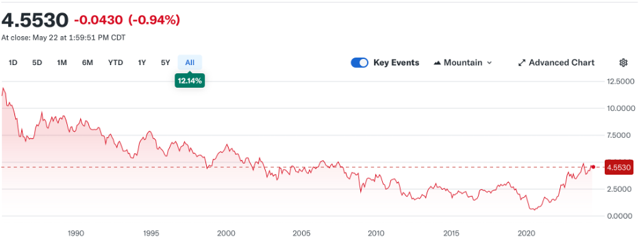 Perspective is an important thing to maintain when looking at markets as it is far too easy to get wrapped up in the short-term blips within a trend and accord them more importance than they’re due. It is with that in mind that I offer the below chart of the 10-year US Treasury yield for the past 40 years.