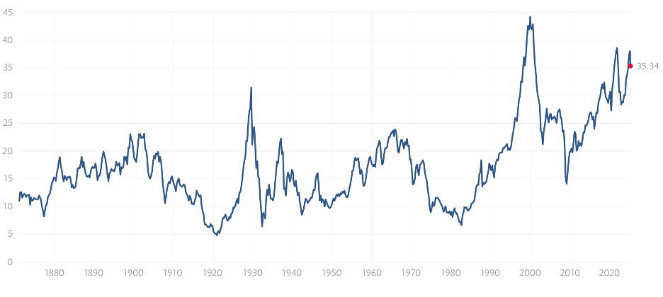As to equity markets, the only clearing event that we have seen was the crash of the NASDAQ after the tech bubble burst in 2000. But again, the Fed was there cutting rates and easing policy to support things. The best evidence that equity markets are at unsustainable levels comes from the valuation metrics, with things like the Shiller CAPE ratio pushed to levels only ever seen in that tech bubble, and clearly significantly above long-term mean (17.21) and median (16.03) levels with today’s current reading of 35.34.