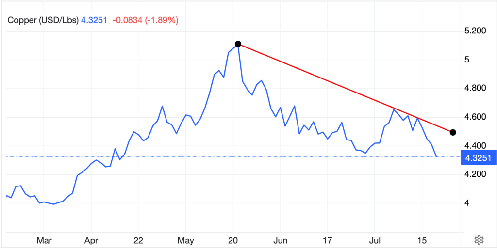 Commodity markets are mostly little changed this morning as oil, which rallied yesterday on further inventory draws according to the EIA, is unchanged and gold and silver are also unchanged this morning. The one outlier is copper (-1.8%) which is continuing its recent declines as it seems the market is calling into question the demand side of the story. While supply is currently adequate, Chinese economic weakness has been a major drag on the perception of demand. I suspect that will change over time, but right now, the chart looks awful.