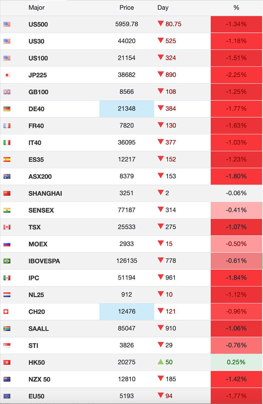 The early movement in equity markets was uniform around the world, and it was not pretty. The below snapshot of equity futures markets, taken at 6:00am this morning shows that the only two markets that have not fallen are China and Hong Kong, and that is only because they remain closed for the Chinese New Year holidays. But there is plenty of fear all around the world, especially considering that markets throughout Europe and Japan, as well as other nations that have not been named targets of tariffs, have also fallen sharply.